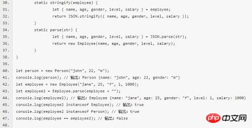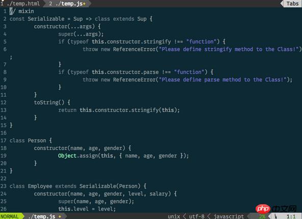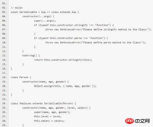 上面的代码,我们用 ES6 的类继承实现了 Serializable,它检查当前实例的类上是否有定义 stringify 和 parse 静态方法,如果有,使用静态方法重写 toString 方法,如果没有,则在实例化对象的时候抛出一个异常。然后通过 class Employ extends Serializable(Person) 来实现可序列化,在这里我们没有可序列化 Person 本身,而将 Serializable 在语义上变成一种修饰,即 Employee 是一种可序列化的 Person。