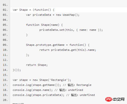 privateData在这个例子中是一个WeakMap的实例 。当一个新的Shape被创建时,一个weakmap的条目会被创建用来以便该实例来保存包含私有数据的对象。在weakmap中最关键的是this ,即使对于开发者来说获取一个Shape对象的引用是微不足道的一件事,他们也无法从实例外来访问到privateData,所以,数据被从麻烦制造者手中安全保护了。任何想要操纵私有数据的方法只能够通过传入实例的this ,从而拿到返回的对象。在这个例子中, getName()会获取对象并返回name属性的值。