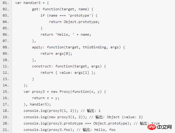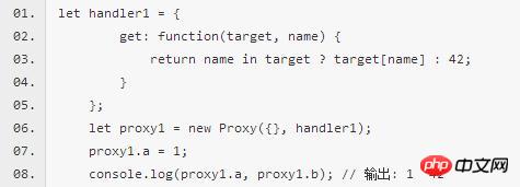 上面代码中,Proxy(代理)对象定义一个target和一个handle,handle实现了一个get捕捉方法。通过这个方法,被代理的对象对于未定义的属性,不再返回undefined,而是返回一个42的数字。