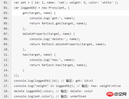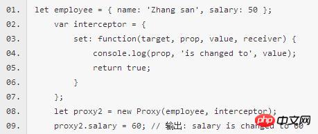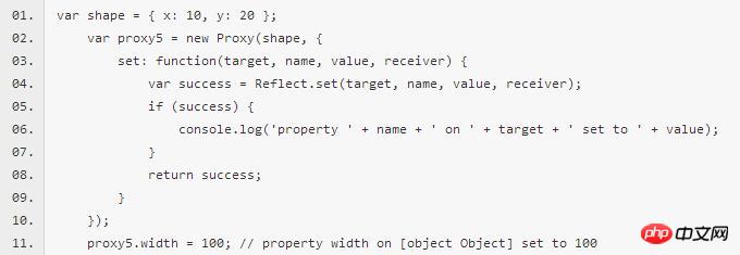 上面代码中,Proxy方法拦截target对象的属性赋值行为,采用Reflect.set方法将值赋值给对象的属性。