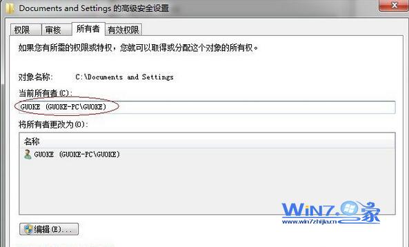 2、在打开的高级设置窗口中,切换到“所有者”选项卡下,这里所有者默认是”SYSTEM“,这边将所有者更改为自己;