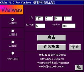 2、Wnuke Wnuke可以利用Windows系统的漏洞, 通过TCP/IP协议向远程机器发送一段信息,导致一个OOB错误,使之崩溃。现象:电脑屏幕上出现一个蓝底白字的提示:“系统出现异常错误”,按ESC键后又回到原来的状态,或者死机。它可以攻击WIN9X、WINNT、WIN2000等系统,并且可以自由设置包的大小和个数,通过连续攻击导致对方死机。