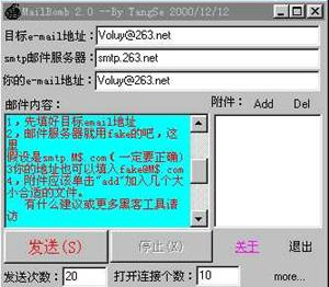 类似的邮箱炸弹很多,它们的原理基本一致,最根本的目标就是涨破您的邮箱,使您无法正常收发E-mail。