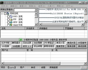 还是小榕的作品。该软件利用asp、cgi对免费信箱、论坛、聊天室进行密码探测的软件。密码探测主要是通过猜测生日的方法来实现,成功率可达60%-70%。溯雪的运行原理是通过提取asp、cgi页面表单,搜寻表单运行后的错误标志,有了错误标志后,再挂上字典文件来破解信箱密码。用溯雪来探测信箱密码真的是很容易,由于许多人对密码的设置采用了自己的生日或常用英文单词等较简单的方式,这给溯雪留下了很大的施展空间。我曾用自己的信箱做过试验,采用生日作为密码,溯雪只用了不到3分钟就成功的破解出了我的密码!要知道我用的字典很大,若字典再小些,会更快的!