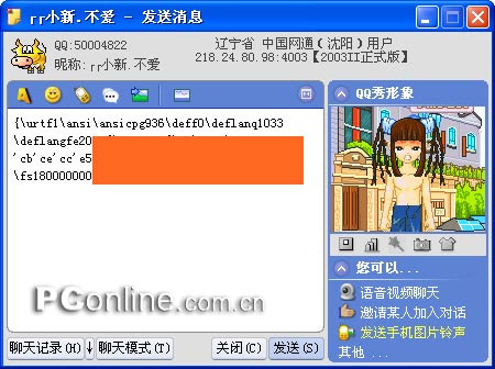 但是12月8日又发现了最新的QQ恶意代码,你只要将代码发送给对方的QQ上(图1),对方的QQ就会立即死掉(图2)。而且这个漏洞在QQ2003II和QQ2003III测试版等最新版本里面也会出现问题,并且以前打的补丁也不起作用。在http://i-3hao.com/down_view.asp?id=19中打最新补丁才能避免这个漏洞的攻击,下载之后运行本安全补丁,找到QQ的安装目录,更新QQ安装目录内的riched20.