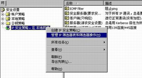 简单的原理就这些了,那如何实现呢?方法如下,LOOK1. 通过对开始->设置->控制面版->管理工具 -> 本地安全策略 ->(鼠标右击)IP安全策略,在本地机器。点击"管理IP筛选器表和筛选器操作",如图1所示。