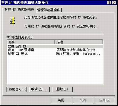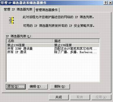 图 21当然,如果你已有了自己的策略或使用系统自代的策略也是可以通过添加规则的方法来实现禁用139/445的目的,但创建"IP筛选器列表"和"管理筛选器操作"是一定要作的。呵呵! 同理你也可以通过IP安全设置里,对ICMP进行策略的制定,限制