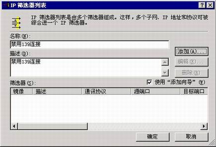 图 34.分别添入名称和描述,如禁用139连接。并点击"添加",接着会出现一个IP"筛选器向导",单击下一步。