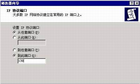 图 78.在"筛选器向导"的"设置IP协议端口"里第一栏为"从任意端口",第二栏为"到此端口"并添上"139",点击下一步。