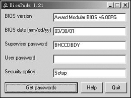 它是免费软件,下载网址为http://www.onlinedown.net/biospwds.htm。使用相当简单,打开下载得到的压缩包,执行其中的Biospwds.exe文件后进入BiosPwds操作界面,要获取BIOS密码只需按下界面上的“Get Passwords”按钮,很快软件就会自动将BIOS各项信息显示于如图1的界面上,这样你便可以很轻松地得知BIOS密码。