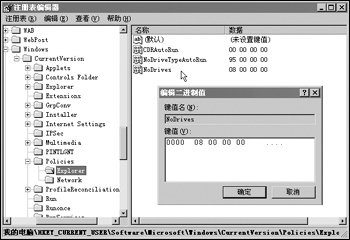右击该二进制值,然后执行快捷菜单中的“重命名”命令,将“新值#1”二进制值改名为“NoDrives”。该值就是用于设置是否隐藏某个驱动器的,它由四个二进制字节构成(缺省值为00 00 00 00)。具体来说,“NoDrives”的第一个字节代表从“A”到“H”的八个盘(其中01为A、02为B、04为C、08为D、10为E、20为F、40为G、80为H)。