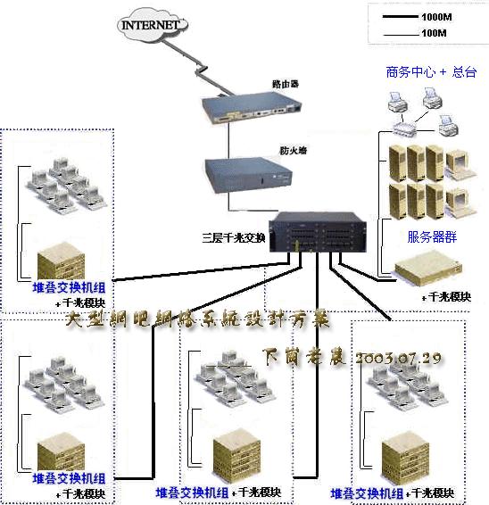 网络的配置与管理。2、二级交换设备选用千兆堆叠交换机组,由可堆叠交换主机和可堆叠交换从机组成无阻塞星型拓扑堆叠结构,可提供 上百个10/100M自适应RJ-45口(视具体设备而定,网吧这种大流量