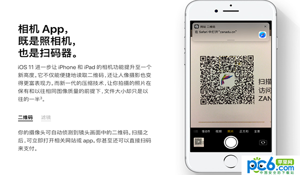 支持读取二维码,新增的各种专业级滤镜,支持 HEVC 编码拍摄,高压缩率的视频拍摄,减少照片与视频的文件大小,减少空间占用但质量不减,同体积更清晰。人像模式将支持拍摄光学防抖、HDR 和闪光灯下的照片。在照片 app 中,回忆里面增加了更多不同类别相册的自动创建, Live Photo 增加循环、来回播放和长曝光模式。