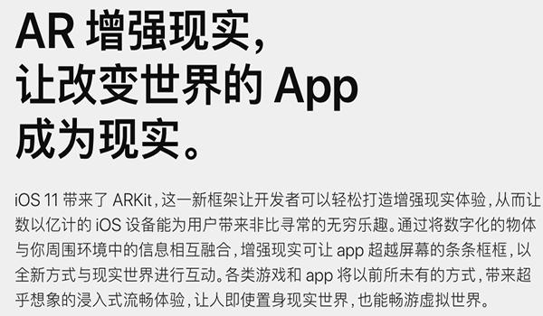 AR 体验是 iOS 11 的一大更新,为此苹果推出了 ARKit 全新平台,方便开发者使用内置的摄像头、处理器和运动传感器在 iOS 设备上开发 AR 体验的应用和游戏。苹果表示,AR 是一种建立在真实世界的视觉技术,能够带来互动游戏或者身临其境的沉浸式体验。另外,苹果还发布了针对 iOS 人工智能的 Core ML 接口,开发者可利用机器学习来创建各种更智能的应用。