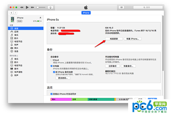 3. 在 iTunes 的设备信息界面,按住 Option 键(Windows 用户在按住 Shift 键),单击「检查更新」按钮;