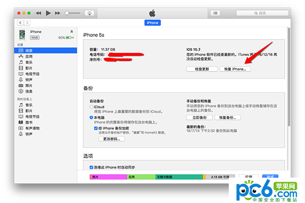 3. 在 iTunes 的设备信息界面,按住 Option 键(Windows 用户在按住 Shift 键),单击「恢复 iPhone…」按钮;