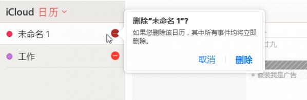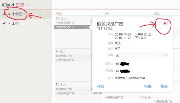 2、登录到电脑的iCloud,进入日历页面。此时发现广告已经占据了第一个日历的标签页。(为了演示,我用小号把自己的日历塞满了广告)垃圾日历的推送通常保存在第一个日历标签页,具体的可以双击垃圾项,点开详情。如图(这里是未命名1):