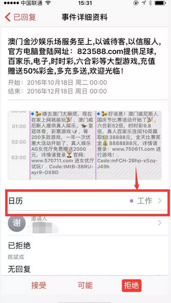 打开日历,在右下角收件箱里,打开垃圾广告的详细界面。按照下图位置,寻找这个垃圾广告对应的是哪个标签。比如,小编之前收到的垃圾广告,就对应在工作这个标签里。