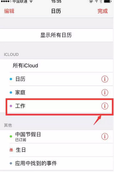 回到日历主界面,点开下面的日历,在显示所有日历页面,点击“工作”右边的感叹号!图标(这个工作标签是由第二步得出的结论),然后直接删除这个日历就可以了。(注意,如果这个标签内有其他重要数据,请先做好备份)。