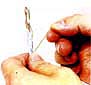 步骤 1:利用斜口错剪下所需要的双绞线长度,至少 0.6米,最多不超过 100米。然后再利用双绞线剥线器(实际用什么剪都可以)将双绞线的外皮除去2-3厘米。 有一些双绞线电缆上含有一条柔软的尼龙绳,如果您在剥除双绞线的外皮时,觉得裸露出的部分太短,而不利于制作RJ-45接头时,可以紧握双绞线外皮,再捏住尼龙线往外皮的下方剥开,就可以得到较长的裸露线。(如图)