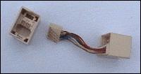 先来看一下笔者手中的网线连接器,它两端分别是两个八根线的RJ-45接口,还可以连接器中间有一道缝隙,用小刀插到缝隙中将连接器撬开,发现其实连接器就是由两端两个RJ-45接口通过中间八根线连接而组成,笔者将RJ-45接口从一端的盒子抽出来给大家看一下(如图3)。然后再从八根导线中间断开,因为我们只需要半边就可以了。大家可以看到接口里有八个接触点(如图4),它们的后边也都连接着相应的导线,我们在后边看到的八根颜色不一样的铜线就是连接接触点的导线。如果将一根网线插到接口里,那么后边这八根导线通过接触点就连接着网线里的导线,换句话说也就是完全代表着网线里的导线,那么我们先分清楚这八根线分别代表着网线里哪一根导线。我们可以看清楚这八根线分成上下两排,上边一排从右向左分别代表着网线水晶头里2、4、6、8位置的导线,那么下边一排的导线从右向左就代表着水晶头里1、3、5、7位置的导线。
