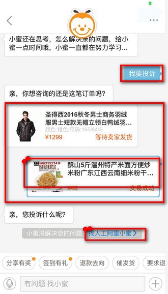 这里必须要告诉大家只有涉及到投诉和维权等方面内容才会转交给“人工阿里小蜜”处理!如下图所示网友们输入投诉关键字,然后阿里小蜜会让你选择需要投诉的订单,然后会弹出如下图所示找“人工阿里小蜜”的链接,点击之后就会马上为大家分配一个有在线ID的客服。