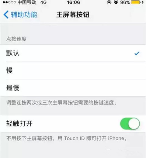 用的不习惯的朋友,可以开启“轻触打开”,之后可以通过指纹识别直接进入iPhone啦,再也不用按一下Home键啦~