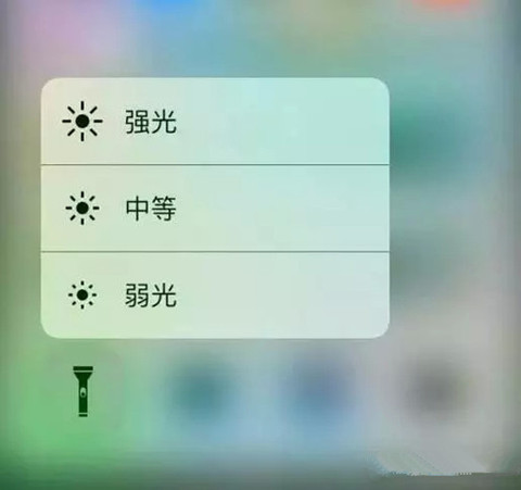 在iOS10中,手电筒还支持调节亮度功能,支持三个档次的选项:低强度、中等强度和高强度,通过 3D Touch 压感操作就会出现相应的亮度调节菜单。