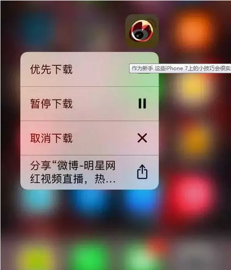 在iPhone7里面,你可以自己安排应用下载顺序啦!在正在下载、更新或恢复的应用图标上,使用3D Touch 轻按操作,屏幕上就会弹出一个快捷菜单,此时选择“优先下载”即可。