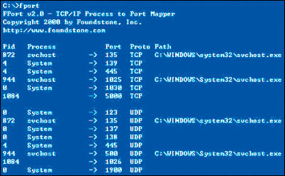 Windows XP。FPort可以把本机开放的TCP/UDP端口同应用程序关联起来,这和使用“netstat -an”命令产生的效果类似,但是该软件还可以把端口和运行着的进程关联起来,并可以显示进程PID、名称和路径。该软件可以用于快速识别未知的开放端口和与之关联的应用程序。FPort的用法比较简单,用法示例如图所示。