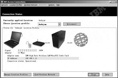 电脑,使用IBM Access Connection软件(如图5)与无线网卡搭配,无线信号强弱的检测值可精确到1%。