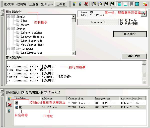默认的bo_peep.dll插件允许攻击者远程控制机器的键盘和鼠标。就实际应用方面而言,Back Orifice对错误的输入命令非常敏感,经验不足的新手可能会使它频繁地崩溃,不过到了经验丰富的老手那里,它又会变得驯服而又强悍。