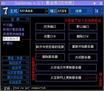 SubSeven具有许多令受害者难堪的功能:攻击者可以远程交换鼠标按键,关闭/打开Caps Lock、Num Lock和Scroll Lock,禁用Ctrl+Alt+Del组合键,注销用户,打开和关闭CD-ROM驱动器,关闭和打开监视器,翻转屏幕显示,关闭和重新启动计算机,等等。