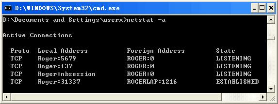 图三显示了一次Netstat检测的例子,检测结果表明一个Back Orifice使用的端口(即31337)已经被激活,木马客户程序使用的是远程机器(ROGERLAP)上的1216端口。除了已知的木马常用端口之外,另外还要特别留意未知的FTP服务器(端口21)和Web服务器(端口80)。