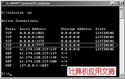 删除这个Justme用户后,我开始查找黑客可能留下的后门。运行cmd.exe并输入netstat -an,发现在一些正常的端口中多出了一个7777端口(如图1)。这个端口看起来非常可疑,我用TELNET去连接它,返回了一个指向D:winntsystem32hack的路径,并且随意输入一个命令它都能够正确执行。看来这的确是黑客留下的一个后门,那它使用的是哪个程序呢?下面我要查看系统的进程。