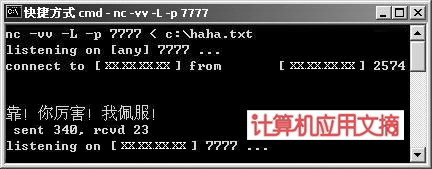 防火墙。 骚扰黑客 本来事情到此就结束了,可是表弟捏紧拳头对我说:“这黑客太可恶了,你一定要帮我抓他杀了出气!”我顿时Crazy Faint。唉,现在的小家伙!最后我决定只轻轻地警告这个黑客。 我从hack文件夹里复制了nc.exe到C盘,然后把其他文件删除。运行cmd.exe后,我笑着对表弟说耍猴开始了。 我在C:下新建了一个文本文件haha.txt,写上一些话后保存(如下图)。在cmd窗口中输入“c:nc.exe -vv -L -p 7777 < c:haha.txt”,看到屏幕显示了“listening on [any] 7777 ...”后就招呼表弟过来一起玩游戏,而把这个cmd窗口放在那里,只时不时地注意一下动静。这是因为,黑客一旦发现失去了这台