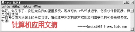 读者想想在黑客那边会出现什么情景?他的连接窗口中会出现我刚才在haha.txt中写的话,足足能让他气上半天的。哈哈,真是痛快!我们不仅得到了他的主机名和IP,还消遣了他一通。