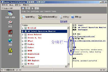 软件检查完毕后,检查页上便会列出在系统中查到的可能有问题的软件。点选某个检查到的问题,再点击右侧的分帧栏,你可以查询到有关该问题软件的发布公司,软件功能、说明和危害种类等信息(如图2)。
