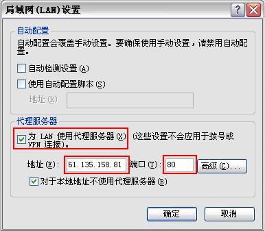 3:在“代理服务器”组,把“为LAN使用代理服务器”打钩,然后填上找到的代理服务器的HTTP地址和端口。推荐也对“对于本地地址不使用代理服务器”打钩。