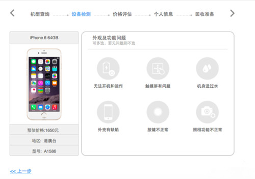 第二:去苹果官网直接以旧换新。苹果中国官网早已推出了以旧换新的政策。据介绍,iPhone 4/4s最高抵130元,iPhone 5/5c最高抵375元,5s最高抵640元,iPhone 6最高抵1700元。小编上苹果官网查看了自己所使用的港行版iPhone 6(64GB版),发现其没有任何毛病下,也仅抵1650元。去苹果官网置换,这种方式优点是方便,快捷;缺点就是很不划算。