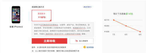 第四,用户也可以选择电商平台,比如京东进行置换。不过京东回收价格并不是很高,小编的iPhone 6只评估了1975元的回收价,而且仅提供等价的京东E卡,也不是很划算。