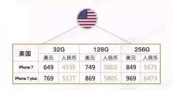 首先看一下美国本土 iPhone 7 的售价,在它的老家,32GB 版本的 iPhone 7/Plus 的售价为 649 美元和 769 美元,约合人民币 4322 元和 5121 元。