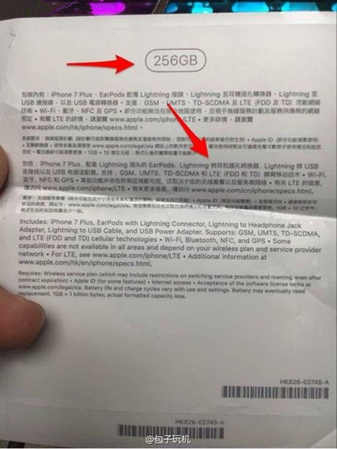 两张谍照分别显示iPhone 7将拥有32GB以及256GB容量版,据悉在这两个版本之间还将有128GB版。包装信息显示,除了iPhone 7 Plus手机之外,还提供了EarPods耳机(Lighting接头),Lightning至耳机插孔转换器、Lightning至USB连接线以及USB电源转换器等附件。如此一来,想用原装耳机边充电边听歌是不可能了。