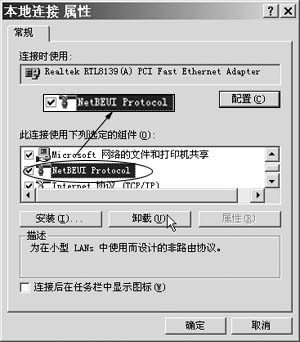 图1卸载不必要的协议当然,对于文件和打印共享服务的137、138、139和445端口,还可以采用以下的方法来关闭。鼠标右击“