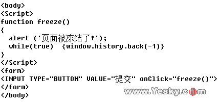如果网页中含有下面这些代码,则当你点击“提交”按钮以后,就会出现“页面被冻结了!”的对话框,然后就会进入页面冻结状态,非常讨厌。代码如下: