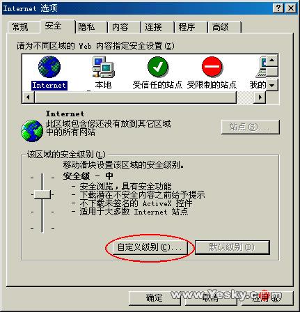 预防措施:打IE浏览器→工具→Internet选项→安全→Internet→自定义级别,把这里所有ActiveX控件和插件都选中“禁止”,选中之后就不会被恶意代码攻击!因为这是一个ActiveX