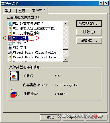 Windows资源管理器”→“工具”→“文件夹选项”→“文件类型”,把滚动条下移找到VBScript和JScript脚本文件,将其删除。