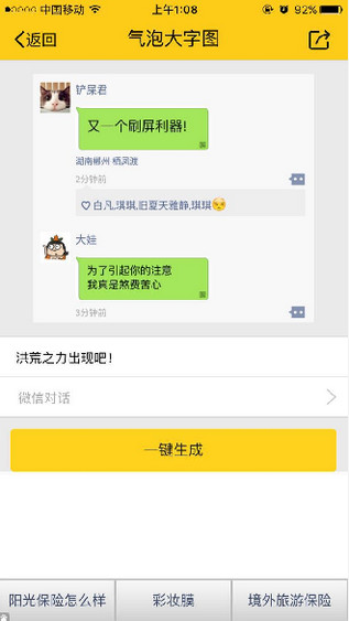 点开之后进入如下图所示界面,亲们只需要在下图所示的“洪荒之力出现吧!”框中输入你所想要用来装逼的文字即可。然后点击一键生成。