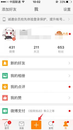 打开新浪微博后,点击下面中间的那个“+”按钮: