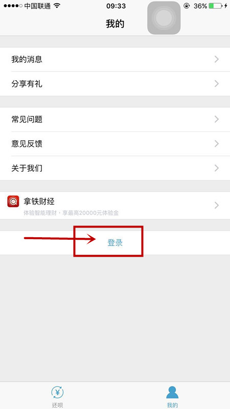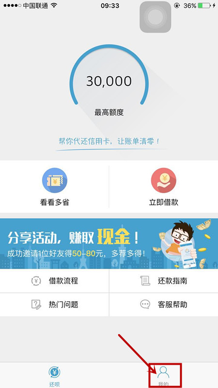 1、点击下载还呗,打开还呗APP,点击右下角的“我的”按钮进入个人中心;